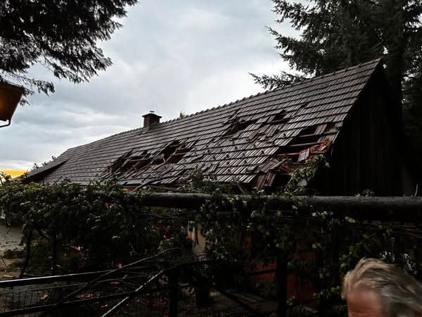 Einsatz, 01.08. um 20:35 Uhr - Unwetter-Einsatz - UnterhausNach kräftigen Windböen stürzte ein Baum auf eine Zufahrtsstraße und in einen Garten. Dabei wurde das Dach eines Wirtschaftsgebäudes stark beschädigt.